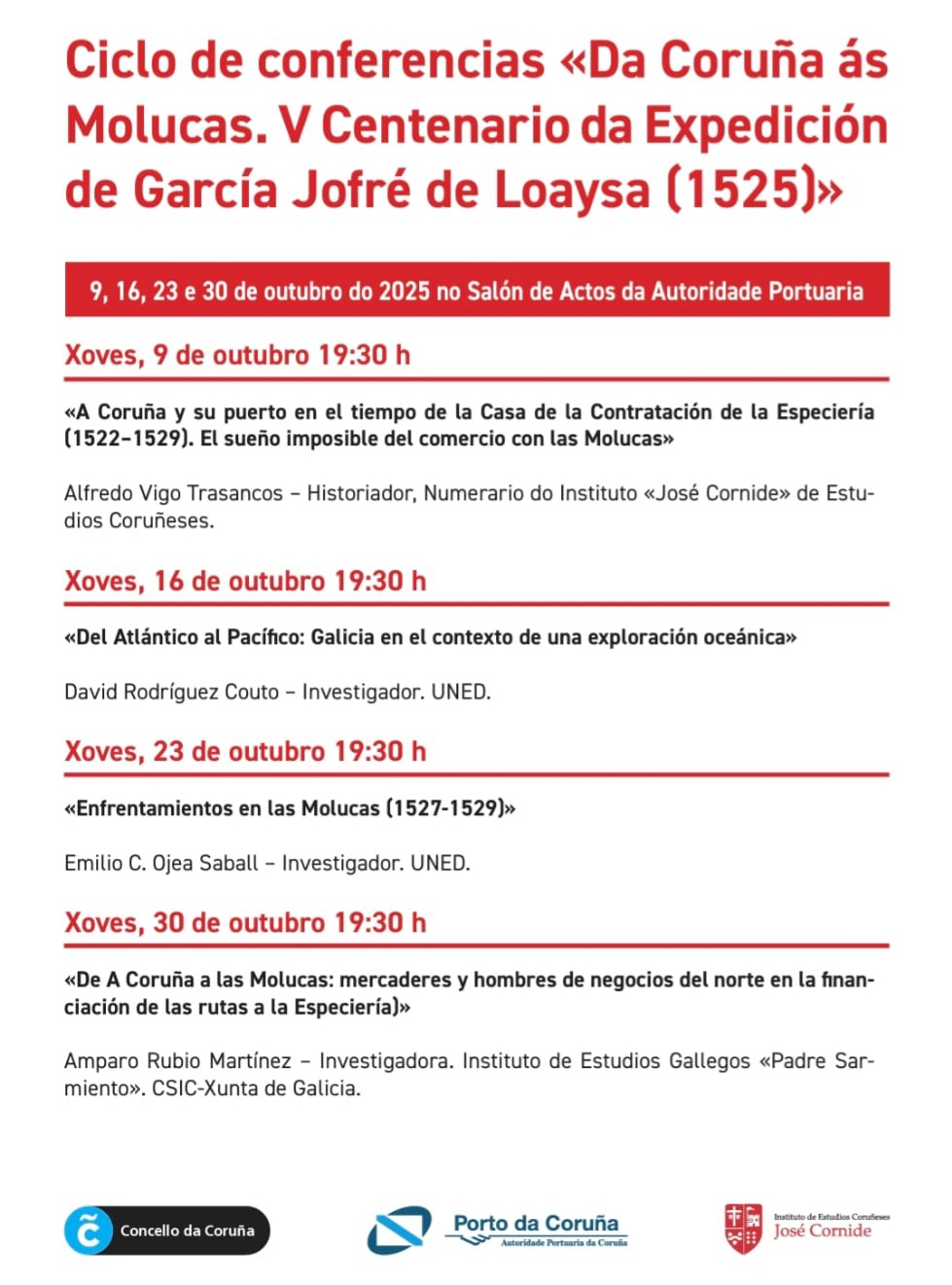 Dentro do ciclo de conferencias “Da Coruña ás Molucas. V Centenario da Expedición de García Jofré de Loaysa (1525)”, con sesións o 16, 23 e 30 de outubro de 2025.