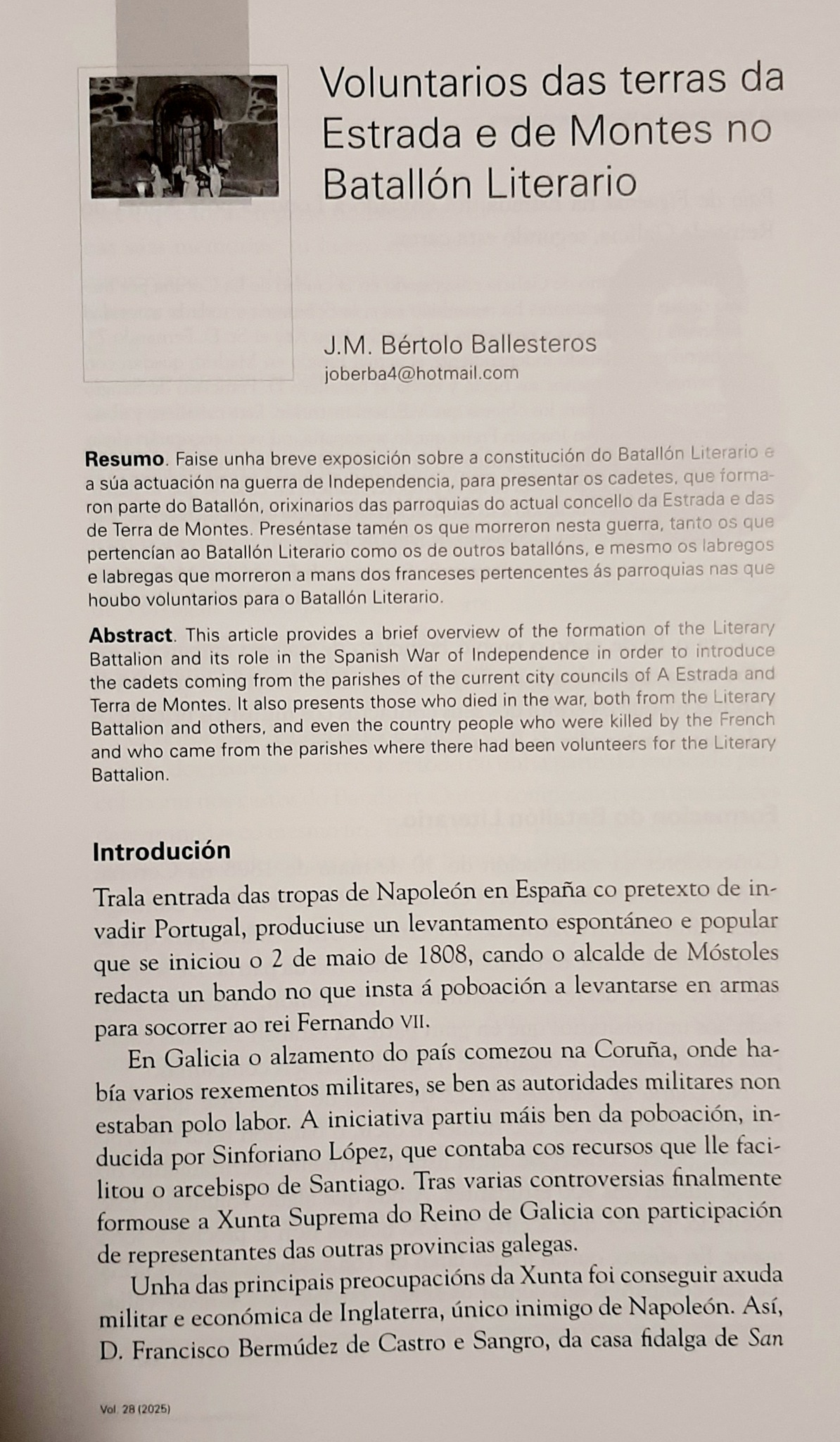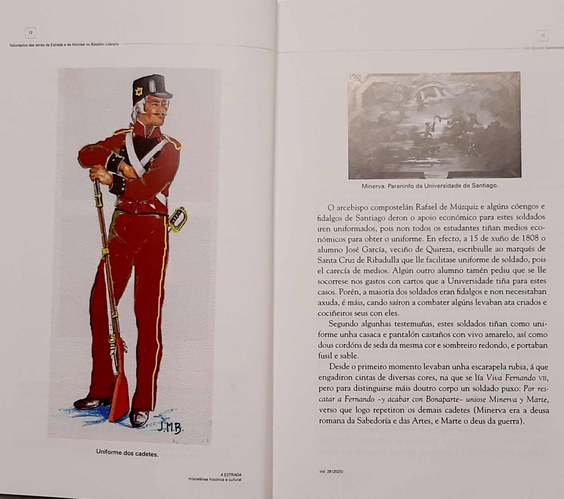 Entre os artigos publicados destaca un traballo do noso compañeiro da Asociación de Estudios Históricos de Galicia, José M. Bértolo Ballesteros titulado “Voluntarios das terras da Estrada e de Montes no Batallón Literario”; no que presenta unha exposición sobre a súa constitución e actuación durante a Guerra de Independencia, a relación dos cadetes voluntarios orixinarios destas terras, a bandeira, uniforme, as campañas do Batallón, ademais das vítimas do exército francés que loitaron por defender a liberdade fronte ao invasor napoleónico.